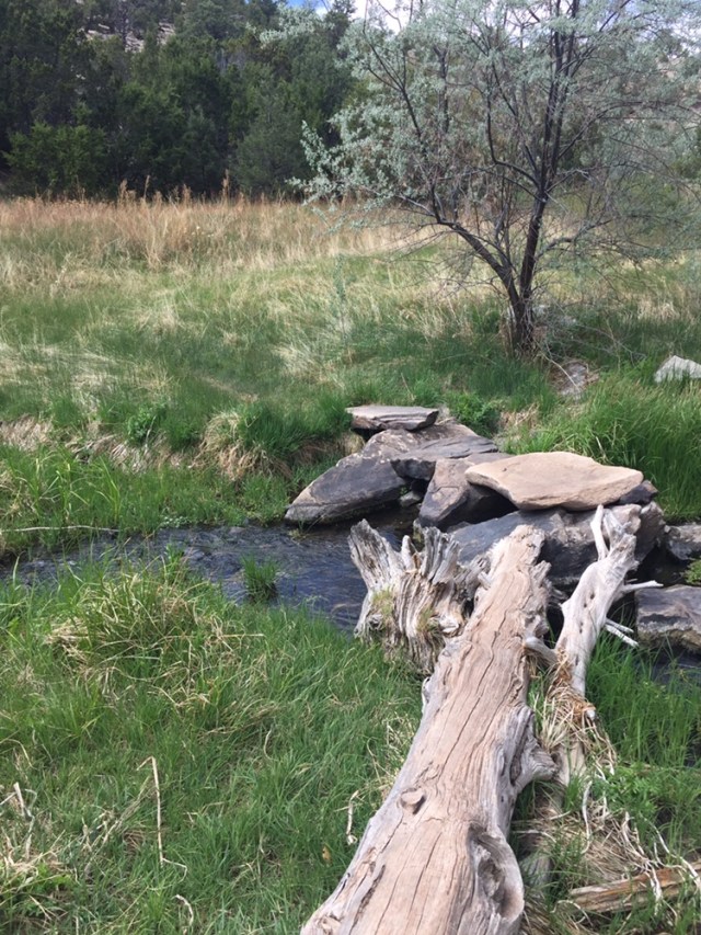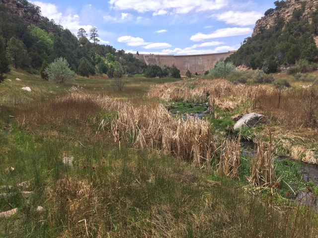 The reality is that Blue Water Lake is your regular average high desert lake that used to be a river. Nice start. But, the real treat was the canyon, located just on the other side of the campground from the lake. There’s a moderately strenuous path down into the canyon and then an easy footpath along a creek and back up to the campground. A trail spoke heads off and continues about another mile down to the base of the dam. We didn’t realize we’d left the loop and were in this spoke and we made it down to this idyllic meadow in the shadow of the concrete wall.